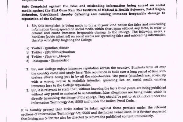 श्री गुरु राम राय इंस्टीट्यूट आफ मेडिकल एण्ड हैल्थ साइंसेज़ के वरिष्ठ अधिवक्ता एडवोकेट एसपी सिंह ने जानकारी दी कि कोर्ट के आदेश के अनुसार अस्पताल परिसर व मेडिकल काॅलेज परिसर में शांति भंग, नारेबाजी पर पूर्णतः रोक रहेगी। कोई भी व्यक्ति या छात्र अस्पताल के यातायात को बाधित नहीं करेगा।