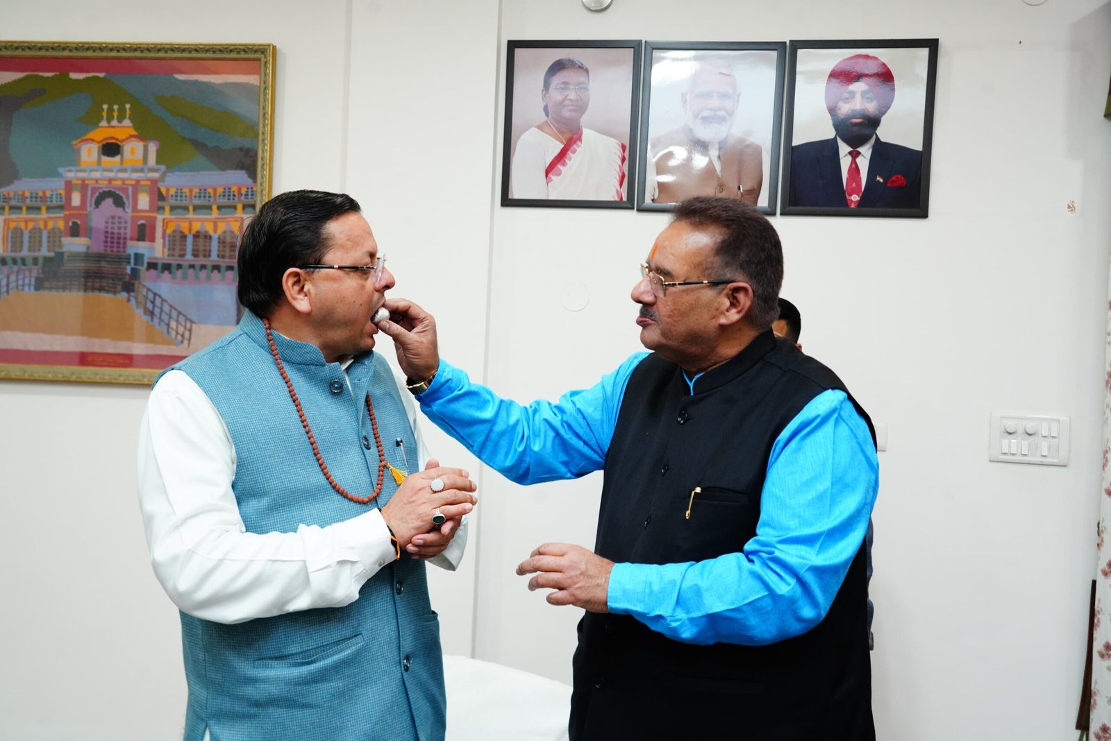 केदारनाथ जीत पर मुख्यमंत्री पुष्कर सिंह धामी को बधाई देते कृषि मंत्री गणेश जोशी