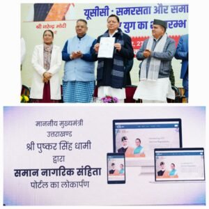 सोमवार को सीएम आवास स्थित मुख्य सेवक सदन में आयोजित समारोह में मुख्यमंत्री श्री पुष्कर सिंह धामी ने विधिवत तौर पर समान नागरिक संहिता की अधिसूचना का अनावरण, यूसीसी पोर्टल ucc.uk.gov.in का भी शुभारंभ और यूसीसी नियमावली बुकलेट का विमोचन किया। यूसीसी पोर्टल पर मुख्यमंत्री ने सबसे पहले अपने विवाह का पहला पंजीकरण कराया, जिसका प्रमाणपत्र मुख्य सचिव श्रीमती राधा रतूड़ी ने मुख्यमंत्री को सौंपा। इस अवसर पर मुख्यमंत्री ने यूसीसी के तहत सर्वप्रथम पंजीकरण कराने वाले पांच आवेदकों को भी प्रमाणपत्र प्रदान किए।