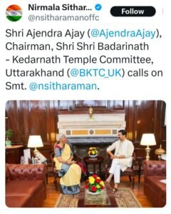 श्री बदरीनाथ – केदारनाथ मंदिर समिति (बीकेटीसी) के अध्यक्ष अजेंद्र अजय ने आज नई दिल्ली में केंद्रीय वित्त मंत्री श्रीमती निर्मला सीतारमण से भेंट कर बदरीनाथ व केदारनाथ धाम में चल रहे पुनर्निर्माण कार्यों और चारधाम यात्रा को लेकर चर्चा की।