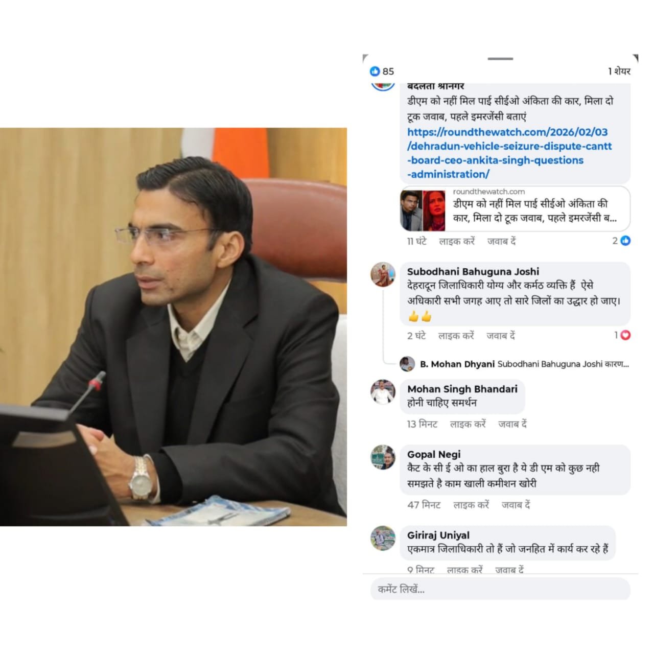 देहरादून। जिलाधिकारी सविन बंसल को लेकर इन दिनों सोशल मीडिया पर जबरदस्त प्रतिक्रिया देखने को मिल रही है। विभिन्न प्लेटफॉर्म पर आम नागरिकों द्वारा उनके समर्थन में बड़ी संख्या में कमेंट और प्रतिक्रियाएं सामने आ रही हैं, जो उनके प्रशासनिक कार्यों और जनसेवा की कार्यशैली को लेकर लोगों के भरोसे को दर्शाती हैं।
