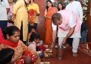 मंत्री गणेश जोशी ने कन्याओं के पांव पखारे, उनको चुनरी ओढाई, आरती उतारी, श्रद्धापूर्वक भोजन कराया