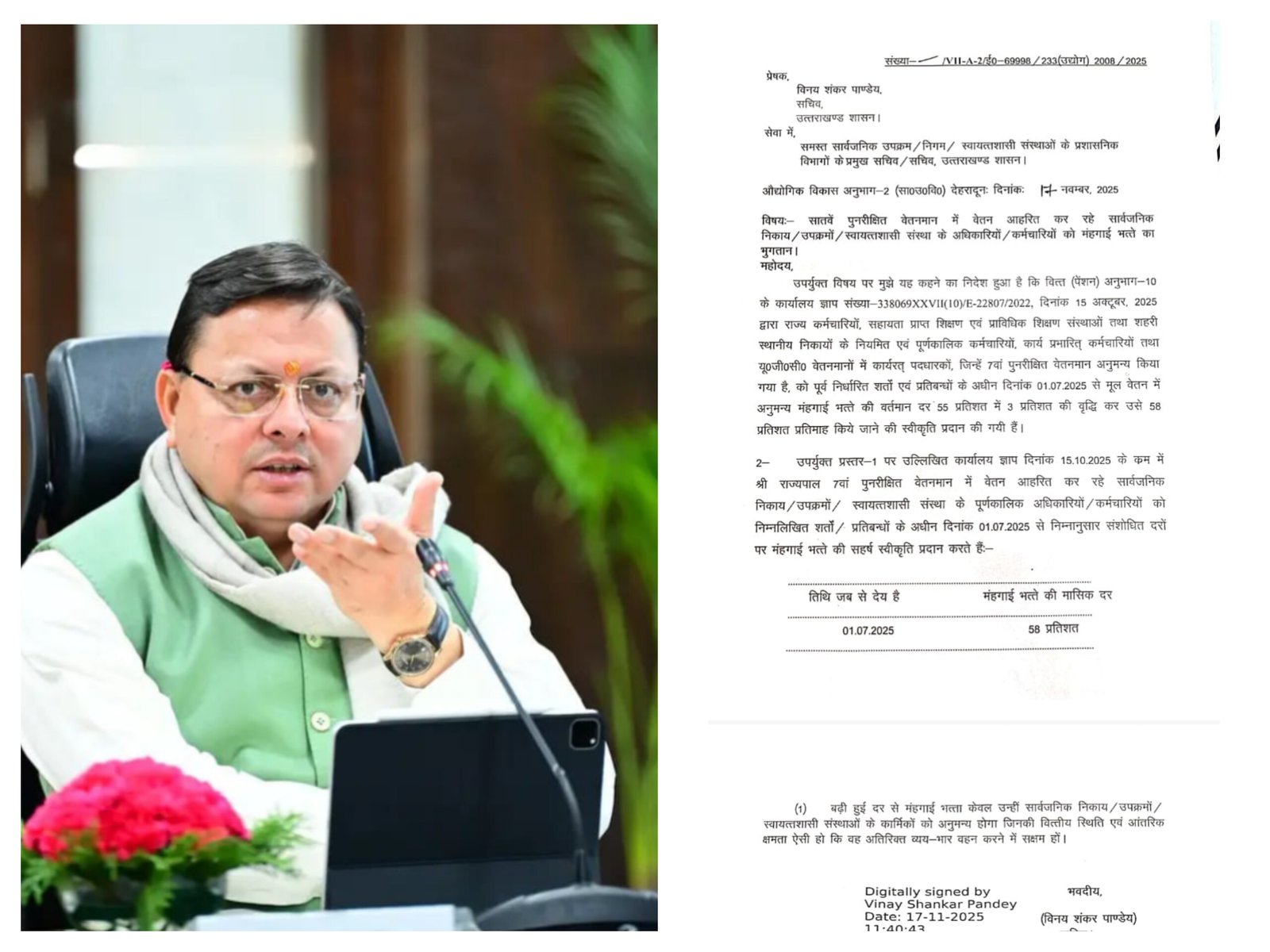 देहरादून। मुख्यमंत्री पुष्कर सिंह धामी के नेतृत्व में राज्य सरकार ने कर्मचारियों को बड़ी राहत देते हुए महंगाई भत्ते (DA) में 3 प्रतिशत की वृद्धि को मंजूरी दे दी है। धामी सरकार लगातार कर्मचारियों के हितों के प्रति गंभीर रही है, और उसी क्रम में सातवें पुनरीक्षित वेतनमान में वेतन आहरित कर रहे सार्वजनिक निकायों, उपक्रमों व स्वायत्तशासी संस्थाओं के अधिकारियों–कर्मचारियों के लिए DA को 55% से बढ़ाकर 58% किए जाने का निर्णय लिया गया है। नई दरें 1 जुलाई 2025 से लागू होंगी।