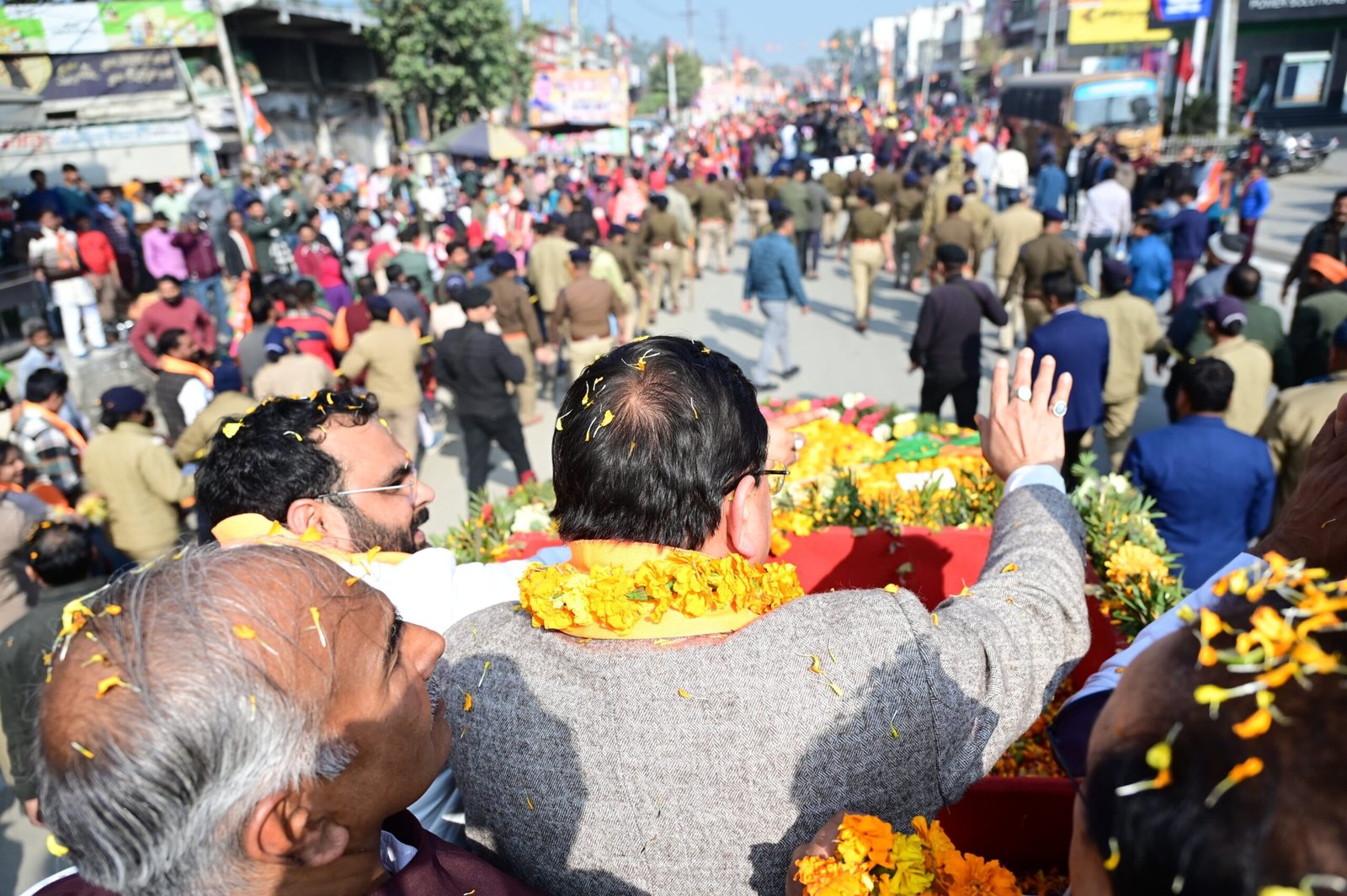 कड़े सुरक्षा इंतजाम और भारी पुलिस बल की तैनाती के बीच यह रोड शो रेलवे स्टेशन से शुरू होकर मुख्य बाजार, रामराज रोड मंडी के सामने जाकर समाप्त हुआ।