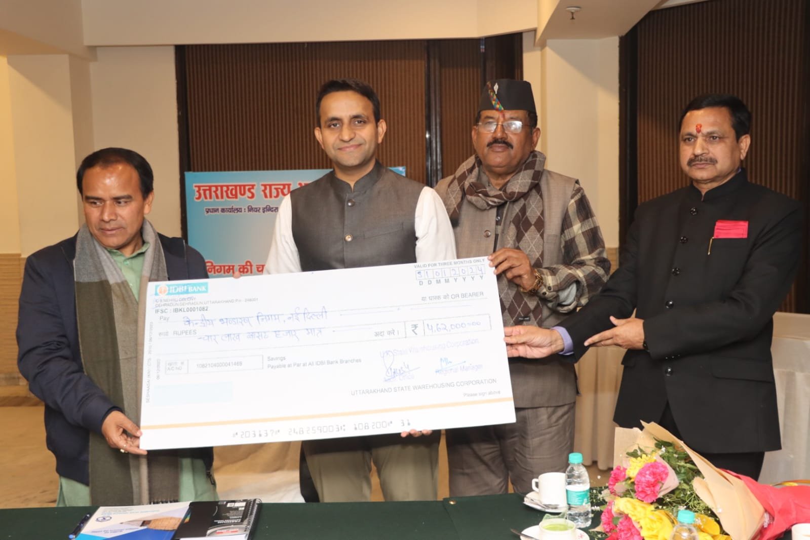 सहकारिता मंत्री डॉ रावत ने राजकीय भंडारा उत्तराखंड की तरफ से केंद्रीय राज्य भंडारण निगम नई दिल्ली को 462000 का व सचिव वित्त उत्तराखंड को 462000 का लाभांश का चैक भी सौंपा।