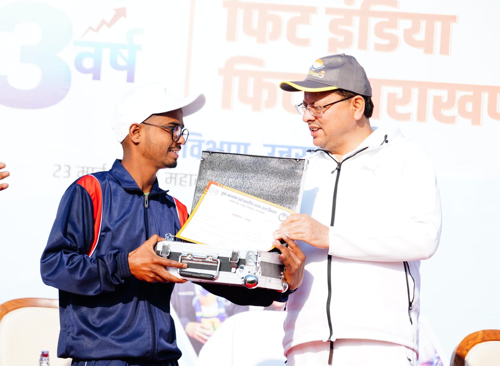 खिलाड़ियों के बीच पहुंचे मुख्यमंत्री ने पुश-अप्स लगाकर खिलाड़ियों का उत्साहवर्धन किया एवं उन्हें फिट रहने के लिए प्रेरित किया। मुख्यमंत्री ने खिलाड़ियों से मुलाकात कर, उन्हें फिट इंडिया की शपथ भी दिलवाई। मुख्यमंत्री ने उत्तराखंड युवा कल्याण विभाग के सहयोग से चलाए जा रहे ड्रोन कोर्स में सर्वश्रेष्ठ प्रदर्शन करने वाले युवाओं को ड्रोन भी वितरित किए।