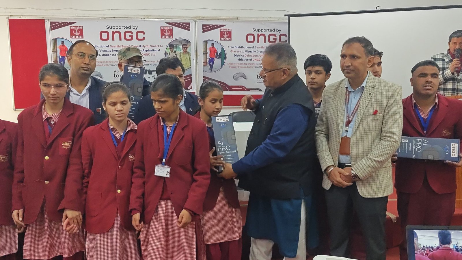 इस डिवाइस का वितरण गुजरात की एक कंपनी टॉर्च इट के द्वारा किया गया। टॉर्च किट के फाउंडर मिस्टर हनी भग्लानि जी एवं ओएनजीसी के सीएसआर हेड अरुण सिंह के द्वारा इस डिवाइस को आदर्श विद्यालय के छात्र एवं छात्राओं हेतु उपलब्ध कराया गया। इस अवसर पर 120 ज्योति आई ग्लास दिव्यांग छात्र एवं छात्राओं को प्रदान किए गए और 190 सारथी स्मार्ट केन छात्र एवं छात्राओं को वितरित किए गए। यह एक ऐसी डिवाइस है जो की 80 से अधिक भाषाओं को ट्रांसलेट कर सकती है। इस डिवाइस के द्वारा दृष्टि दिव्यांग छात्र कलर और 300 विभिन्न प्रकार के ऑब्जेक्ट भी पहचान पाएंगे। इस डिवाइस के द्वारा प्रिंट में लिखा हुआ मटेरियल दृष्टि दिव्यांग अपने मोबाइल के दद्वारा पढ़ पाएंगे। इस डिवाइस में जीके के क्वेश्चन भी दिए गए हैं। यह डिवाइस छात्र एवं छात्राओं को उनके शैक्षणिक कार्यों में सपोर्ट हेतु और उनके सशक्तिकरण हेतु महत्वपूर्ण रोल निभाएगी।